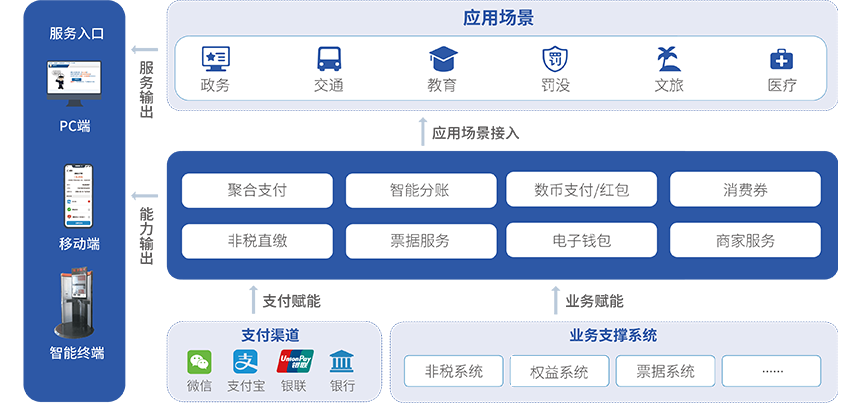 “城市统一支付平台”的建设相当于是打造政府的支付宝,平台聚合多种支付渠道(微信、支付宝、银联、商业银行),让用户可以在一个平台上完成各种支付需求。无论是交通出行、政务办事还是水电煤的充值缴费,统一支付平台都可以轻松应对。